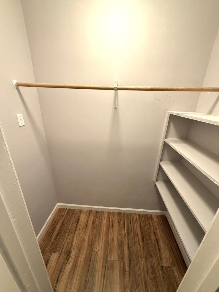 El piso es laminado resistente y fácil de limpiar, complementando la decoración minimalista del espacio.