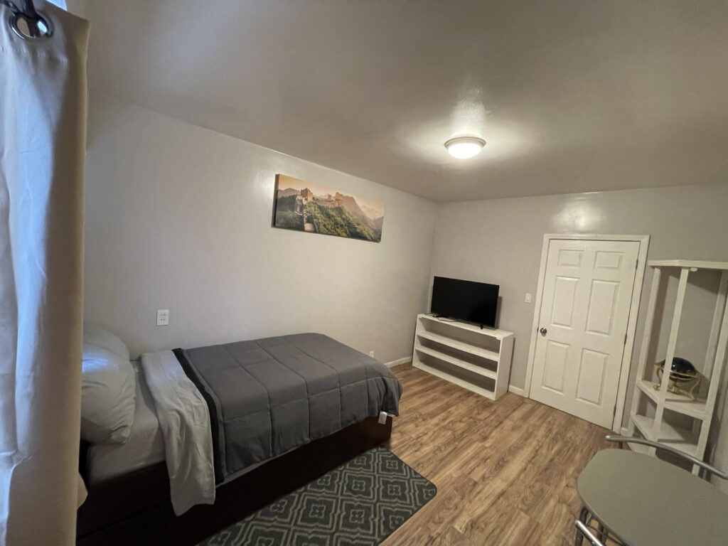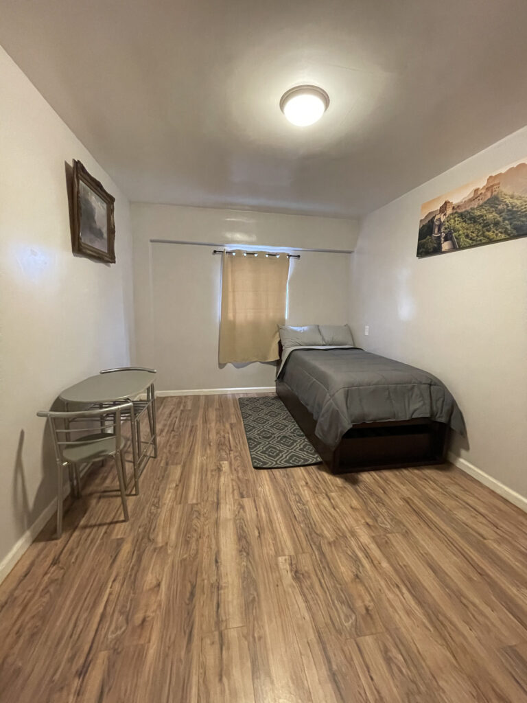 El mobiliario adicional incluye una pequeña mesa de estudio y un par de sillas, perfectas para trabajar o estudiar desde casa. El piso es laminado resistentes y fácil de limpiar, complementando la decoración minimalista del espacio.