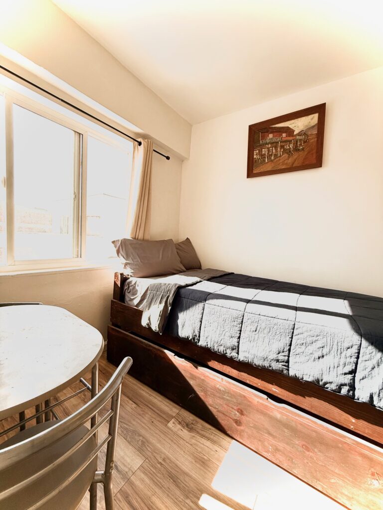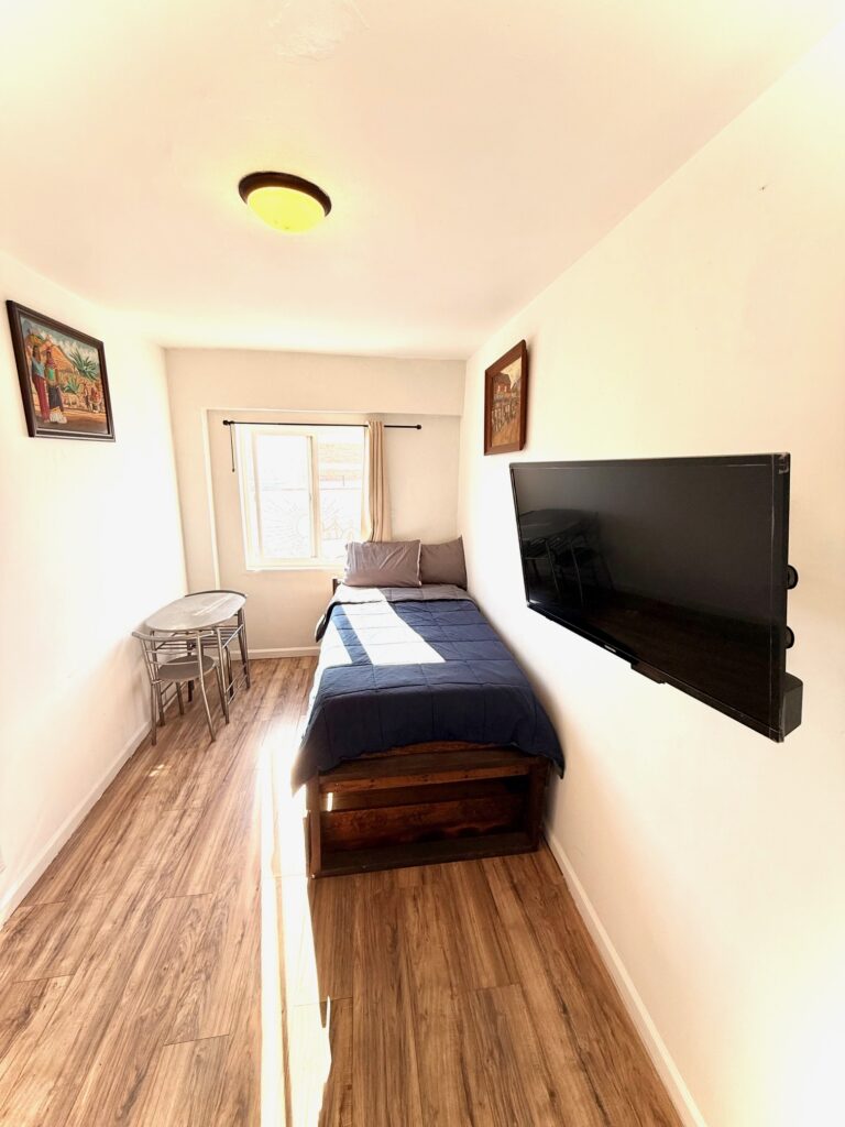 La habitación cuenta con una cama individual, optimizando el espacio disponible, y un armario empotrado que proporciona suficiente capacidad para almacenar ropa y objetos personales. La iluminación natural entra a través de una ventana que también permite la ventilación adecuada, creando un ambiente fresco y agradable.
